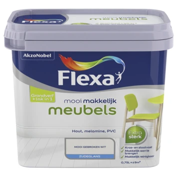 Flexa Mooi Makkelijk meubels is een lak waarmee meubels in een handomdraai opknapt. Het is makkelijk in gebruik, omdat je geen grondverf nodig hebt. Flexa Mooi Makkelijk meubels is specifiek afgestemd voor jouw meubelen en is te gebruiken op praktisch alle ondergronden. Je kunt meteen aan de slag. Snel. Simpel. Als nieuw. De lak is extra sterk, kras- en stootvast, makkelijk reinigbaar en kan gebruikt worden op hout, melamine en PVC. De inhoudsmaat is 750 ml. Flexa Mooi Makkkelijk is ook verkrijgbaar voor vloeren, keukenkasten en deuren & kozijnen.