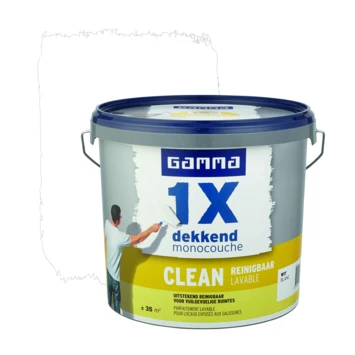 GAMMA 1x dekkend muurverf Clean is een optimaal dekkende, uitstekend reinigbare, matte latexverf. Vuil en vlekken op de muur laten zich met een vochtige doek gemakkelijk verwijderen zonder dat er glimmende plekkenoverblijven. Ideaal voor muren in vuilgevoeligeruimtes binnenshuis zoals hal, kinderkamer en woonkamer. Reukarm, ademend en gemakkelijk aan te brengen. Afhankelijk van de kleur en kwaliteit van de ondergrond dekt deze verf in één laag. Is je muur nog onbehandeld? Gebruik dan voorstrijk voor een optimaal dekkend resultaat. Deze emmer van 5 liter is voldoende voor het schilderen van circa 35 m². Verkrijgbaar in wit en RAL 9010.