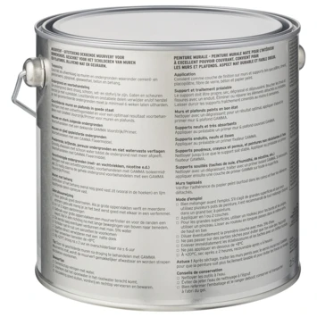 De GAMMA muurverf voor binnenshuis is geschikt voor het schilderen van muren en plafonds. De GAMMA muurverf wolkengrijs mat 2,5 L is een geur arme watergedragen muurverf. Het blik heeft een inhoud van 2,5 liter, dit is voldoende voor een oppervlakte van ongeveer 20 m². Twee uur na het aanbrengen van de verf is deze reeds stofdroog, na 6 uur kan je de volgende laag aanbrengen. De beste temperatuur om met deze verf te werken is tussen de 8 en 25°C.