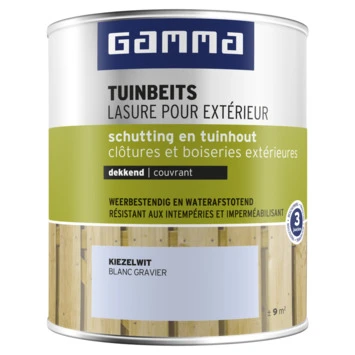 GAMMA Tuinbeits voor schutting & tuinhout is een dekkende, glanzende beits op basis van terpentine. Voor duurzame bescherming tot 3 jaar van schuttingen, speeltoestellen en tuinhout. GAMMA Tuinbeits dekkend dringt goed in het hout, beschermt tegen weersinvloeden zoals regen en zon, is vochtregulerend en maakt het hout waterafstotend. Ook zeer geschikt voor geïmpregneerd hout. Dekkende tuinbeits dekt de houtnerf af, de natuurlijke structuur van het hout blijft wel zichtbaar. Voorbehandelen met grondverf is niet nodig. Stofdroog na ± 4 uur en overschilderbaar na ± 18 uur. Schilder in dunne lagen en laat goed drogen voordat je