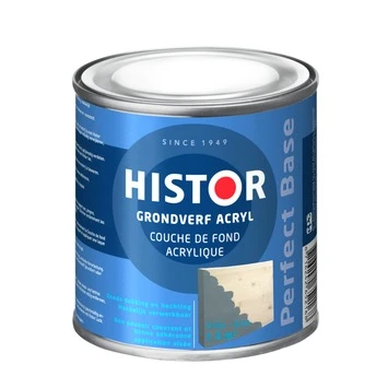 Histor Perfect Base grondverf grijs 250 ml hecht en dekt goed. De verf is watergedragen en toepasbaar op nieuw hout, bestaande verflagen, mdf plaatmateriaal en zelfs voorbehandeld staal. De inhoudsmaat is 250 ml.