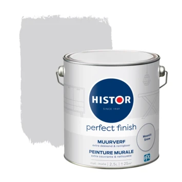 Histor Perfect Finish muurverf Moonlit Snow is een extra dekkende muurverf, ideaal voor alle muren in uw huis. Eenmaal aangebracht bent u verzekerd van een matte uitstraling die langdurig mooi blijft. Naast de standaard beschikbare kleuren is deze verf in meer dan 30.000 verschillende kleuren te verkrijgen bij onze verfmengbalie in de GAMMA bouwmarkt. Voor het beste resultaat kunt u het beste vooraf een dekkende voorstrijk gebruiken. Zorg voor stijlvolle, matte muren in huis met Histor Perfect finish muurverf mat. De inhoudsmaat is 2,5 liter.