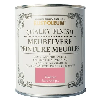 Rust-Oleum Meubelverf Oud roze 750 ml is perfect om meubels een nieuwe uitstraling te geven. De verf mag rechtstreeks op hout (blank of geverfd), baksteen, tegel, pleister of elk ander voorbehandeld hard oppervlak worden aangebracht. Creëer een vintage look door twee lagen in contrasterende kleuren aan te brengen en deze zacht op te schuren wanneer de verf droog is. Werk voor het ultieme resultaat de Rust-Oleum Meubelverf Oud roze 750 ml af met een beschermende laag Rust-Oleum Meubelwas of Rust-Oleum Meubelvernis mat.