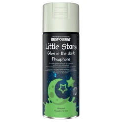 Rustoleum Little Stars Glow in the Dark Spray Maanstof 400ml kan gebruikt worden op muren, plafonds en andere objecten. De verf zal als het ware “opladen” door de blootstelling aan licht (natuurlijk en kunstmatig) en wanneer het geschilderde object in het donker wordt geplaatst, zal de verf oplichten.
