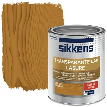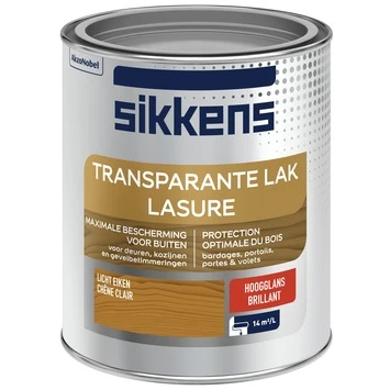Sikkens transparante buitenlak is geschikt voor het aflakken van houten deuren, kozijnen en gevelbetimmering. De lak is op basis van alkydhars, beschermd tegen UV-stralingen en andere weersinvloeden. De houtnerf blijft mooi zichtbaar met deze zijdeglans transparante lak. Je kunt het met de kwast of met de roller aanbrengen op onder andere deuren en kozijnen.